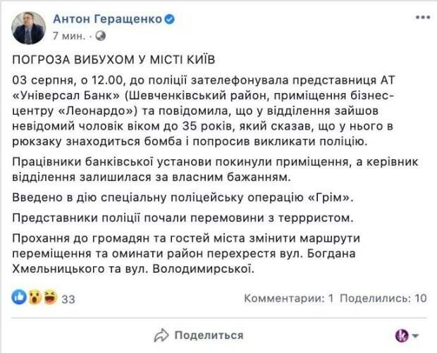 В Киеве захватили банк с заложницей Об этом сообщил замминистра МВД Антон Геращенко. "3 августа, в 12.00, в полицию позвонила представительница АО «Универсал Банк» (Шевченковский район, помещения бизнес-центра «Леонардо») и сообщила, что в отделение зашел неизвестный мужчина в возрасте до 35 лет, сказал, что у него в рюкзаке находится бомба и попросил вызвать полицию.
