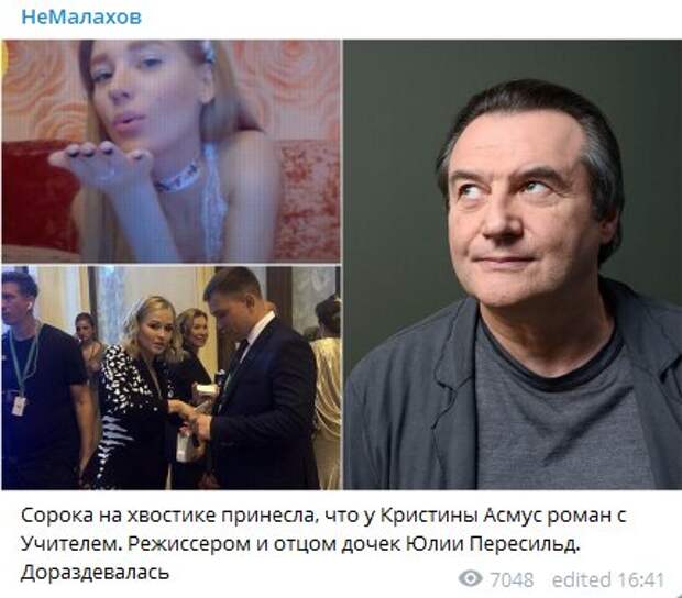 32-летней российской актрисе Кристине Асмус приписывают отношения с известным режиссером Так, авторы телеграм-канала «НеМалахов» пишут, что Асмус закрутила роман с 69-летнем Алексеем Учителем. "Сорока на хвостике принесла, что у Кристины Асмус роман с Учителем. Режиссером и отцом дочек Юлии Пересильд.