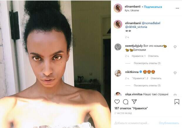 При этом внимание к себе тут же привлекают глаза красотки. Они выглядят неестественно большими и золотистыми, что не похоже на природный цвет глаз артистки. По-видимому, для этого эффекта Мбани надела линзы либо отредактировала снимок. Отметим, что несмотря на эту дерзкую деталь артистка позирует без косметики, демонстрируя свою естественную красоту. Ее поклонники не могли пройти мимо такого фото. При этом мнения по поводу эксперимента звезды с внешностью разделились. «Вот это кошка. Батюшки», «Зачем такие страшные глаза сделала, тебе не идет», - пишут люди. Ранее мы писали, что артистка опубликовала очень горячий снимок. Мбани была одета в синее платье с необычным вырезом вверху. Она засветила идеальную зону декольте. Как известно, красотка очень худая, поэтому ее ключицы и красивые тонки руки просто сводят поклонников с ума. Девушка красовалась в разных позах, абсолютно не стесняясь камеры. «Обожаю, когда Марта Адамчук фотографирует», - подписала фото Элина, намекая, что ее фотографировала коллега по «Женскому кварталу». Напомним, экзотическая красотка из «Квартал 95» впечатлила изгибами в откровенном платье. Как сообщала Politeka, шаловливые красотки из "Квартал 95" показали, как развлекаются летом: топ самых жарких фото. Также Politeka писала, что экзотическая красотка из «Квартал 95» пленила нежным образом в обтягивающем платье: глаз не отвести.
