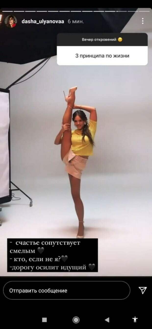 Экс-участница шоу "Холостяк-10" с Максимом Михайлюком, победительница проекта Даша Ульянова рассказала о личном в Инстаграм Даша решила устроить в Инстаграм вечер вопросов и ответов, публикуя самое интересное в разделе Стори. Так, девушка ответила, что из главных принципов по жизни может выделить три, среди которых будут: Счастье сопутствует смелым; Кто, если не я?