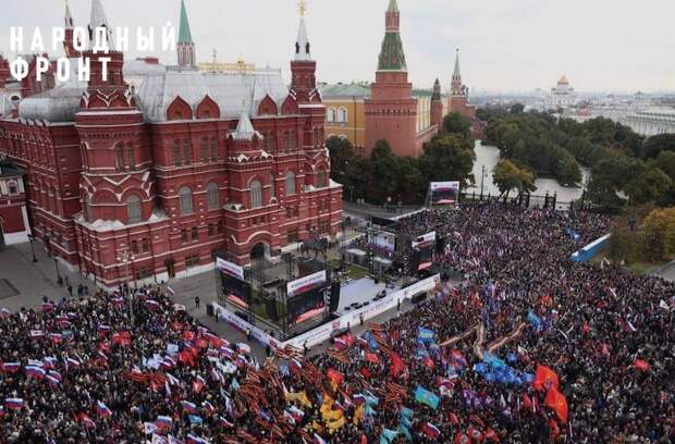 Более 50 тыс человек собрались сегодня в Москве на Манежной площади на митинг-концерт в поддержку референдумов в ЛДНР «Своих не бросаем». Участники акции пришли на митинг с российскими и красными флагами и георгиевскими лентами.