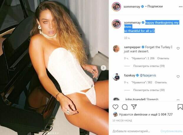 Соммер была в корсете на завязках, который подчеркнул ее стройную талию и приподнял грудь. Также звезда надела крохотные трусики, благодаря которым можно было рассмотреть красивые ягодицы. Модель повернулась к камере спиной ради жаркого кадра. "Шелковые" ягодицы прямо блестели на свету и выглядели, как поджаренные булочки. Различные украшения стали отличным завершением откровенного образа. "С Днем благодарения, мои любимые я так благодарна за всех вас