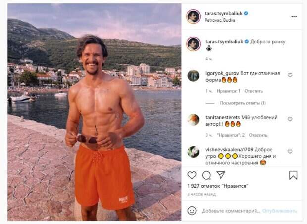 В этот раз Цымбалюк решил показать, как отдыхает в Черногории. Красавчик позировал на фото в одних шортах, демонстрируя роскошную фигуру и улыбаясь на камеру. "Доброе утро", - написал Тарас. Фанаты сразу начали комментировать публикацию: "Вот где отличная форма", "Мой любимый актер", "Доброе утро. Хорошего дня и отличного настроения", "Классной и хорошей субботы вам", "Чудесный отдых", "Доброе утро", "Хорошая форма, даже после второго ужина", "Доброе утро, хорошего вам дня", "Ты как всегда потрясающий, доброе утро. Наслаждайся отдыхом много". Сообщалось, что известный украинский актер Тарас Цымбалюк удивил кадрами возле роскошной машины. На свежем фото Цымбалюк позировал возле роскошной машины марки Porsche. Он сидел на асфальте, а на сзади него красовался автомобиль, о котором он мечтает. Напомним, Цымбалюк из "Крепостной" показал изувеченное лицо, поделившись новостями А еще Politeka писала, что Цымбалюк из "Крепостной" покорил украинок одним взглядом, не устояла даже Сумская Также Politeka сообщала, что Цымбалюк из «Крепостной» появился под ручку с известной актрисой