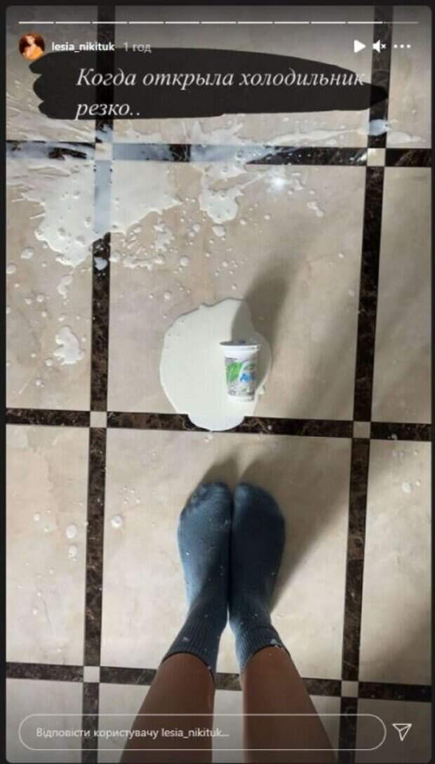 Как оказалось, Никитюк запачкала пол на кухне. Красотка резко открыла холодильник, из-за чего выпал стаканчик с кисломолочным продуктом, который был в дверце, видимо. "Когда открыла холодильник резко", - написала Леся под фото. На кадре также можно увидеть роскошные ножки красотки. Никитюк надела только носочки, которые запачкались. Никитюк также добавила снимок обложки журнала. На нем Леся позировала рядом с Сергеем Притулой. Как оказалось, в выпуске будет идти речь о дружбе и работе звездных телеведущих. Напомним, Никитюк вслед за Ким Кардашьян надела экстравагантный наряд и оконфузилась А еще Politeka сообщала, что Никитюк в роскошных ботфортах и мини приковала взгляды к стройным ножкам Также Politeka сообщала, что Леся Никитюк в смелом наряде затмила мохнатую Настю Каменских на светском рауте