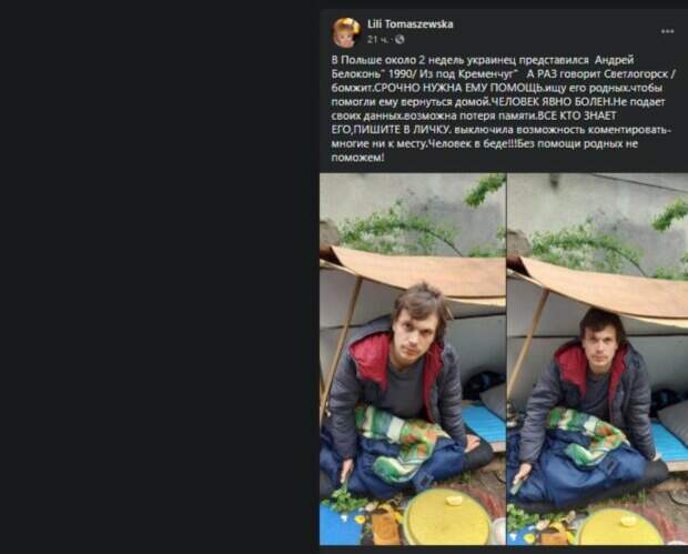 В сети ищут родных украинца, которого нашли в Польше Как передает Politeka.net, призыв о помощи разместили в Facebook-сообществе "Жди Меня" поиск пропавших людей. 31-летний мужчина уже более недель живет под открытым небом. Представился он Андреем Белоконем. Судя по всему, мужчина болен, поскольку сначала говорил что родом из по Кременчука, а позже - из Светлогорска.