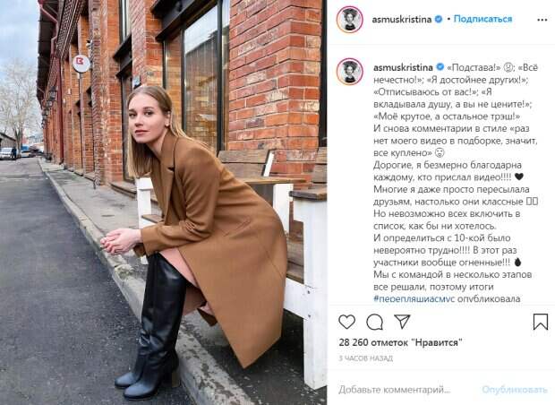 Известная российская актриса и бывшая жена Гарика Харламова Кристина Асмус обратилась к фолловерам с благодарностью за танцевальные видео, которые ей присылали Об этом сообщает Politeka со ссылкой на страницу Асмус в соцсети. Так, Асмус подвела итоги своего конкурса и пожаловалась, что некоторые обвиняли ее в "подставе".