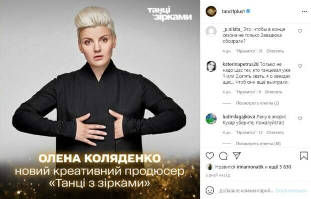 Девушка обещает "взорвать" новый пятый сезон неожиданными изменениями. «Я очень счастлива и благодарна за возможность окунуться в «кухню» этого легендарного танцевального шоу. С головой ныряю во все детали проекта, чтобы получить кайф самой и показать зрителям интересные подробности того, как звезды учатся танцевать. У нас будет неожиданный звездный состав участников. Все они интересны прежде всего как люди, и мы с командой стремимся раскрыть каждого из них для зрителя», - сообщила Коляденко. Пользователи кинулись комментировать. Многие потребовали у организаторов заменить судейский состав. В частности, публика недовольна тем, что пятый год подряд в жюри прима-балерина Екатерина Кухар. Последняя успела прославиться своей строгостью к участникам. "Если бы ещё ведущих и жюри поменяли - о да жюри уже точно нужно менять, а особено Кухар и Яму нужно убирать" "Танцы со звездами" требуют кардинальных изменений!!! Хватит людям показывать одно и то же. Нужна полная перезагрузка шоу" "Пора менять судей -  Да, Шоптенко вместо Кухар, Монатика вернуть как постоянного судью! Третьим пусть будет Дикусар. А четвёртым со второго эфира будет тренер-джокер