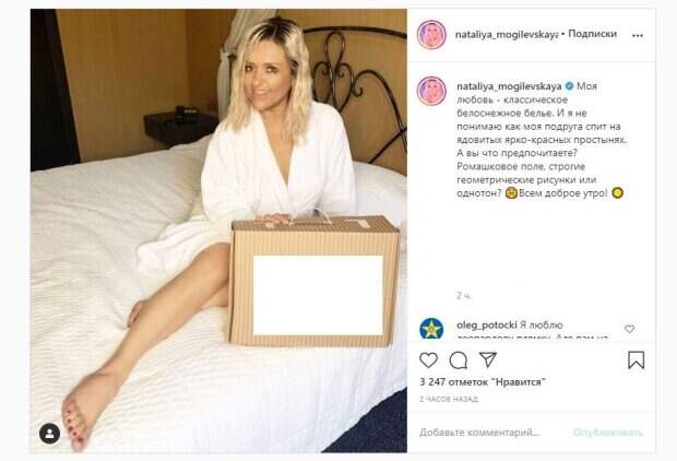 Известная украинская певица Наталья Могилевская показала себя и рассказала о предпочтениях На фото Наталья позировала в белом халате, сидя на белой кровати. Красотка улыбалась на камеру, а волосы оставила распущенными. Могилевская вытянула ноги вперед, демонстрируя педикюр. Певица, как можно заметить, скорее всего была без белья.