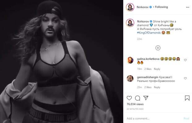 Поп-король российской эстрады Филипп Киркоров представил себя в роли популярной певицы Рианны Как пишет Politeka.net, он опубликовал на своей странице в социальной сети "Инстаграм" странное видео, которое вызвало бурную реакцию поклонников (чтобы посмотреть, скрольте до конца). При помощи специальной программы лицо Филиппа Киркорова "приставили" к телу Рианны в ее клипах.