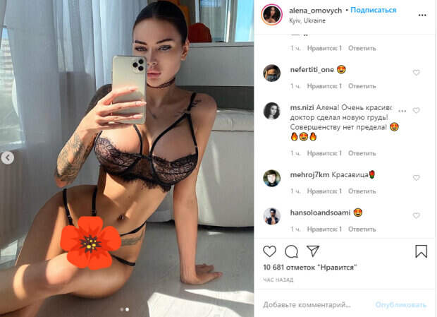 На двух новых фото Омович позирует в стильном черном кружевном белье с множеством тоненькими лямками и специальными декоративными элементами на груди и талии, подчеркнувшими ее привлекательность. «Без фильтров фото больше нравятся?🤔», - написала Алена под постом. Фанаты сразу же отреагировали: «Зажигай, малышка😍😍», «🔥🔥очень», «Так лучше))», «Такая обработка лучше», «Очень большая грудь🔥🔥🔥😮😮😮», «Ален ты меняла внешность, или от природы такая красота?», «Ты нереальная красотка ❤️», «Настроилась👍», «Красотка🤗», «Алёна ты шикарна! 🔥✨💔», «Шикарная», «Вот такая прическа тебе идёт», «Как это красиво❤❤❤ И с фильтрами, и без». Ранее модель, которая прославилась не обычной стройностью при росте свыше 170 см, в этот раз решила показать, как занимается уходом за собой и своей кожей, чтобы та имела идеальный золотистый загар. Тем не менее, желание преобразить себя оценили не все пользователи сети. Девушка решила рассказать, что она любит солярий, но главное знать меру. Раз в неделю она ходит в горизонтальный солярий с темным кремом на 200 бронзантов. "Объясню почему солярий мне пошёл на пользу, а не во вред. У меня жирная кожа лица, склонная к высыпаниям. Любые средства которые мне советовали, не давали нужного эффекта. Я просто блещу как новогодняя елка и все) а забивать поры матирующей пудрой мне как-то не хочется. Солярий же оказался идеальным вариантом для меня". Напомним, украинская Кардашьян запихнула нереальные размеры под тонкую маечку. Как сообщала Politeka, украинская Кардашьян соблазнила пикантным видом в "золотом" бикини. Также Politeka писала, что украинская Кардашьян расстегнула косуху и показала свое пышное "добро". admixerML.fn.push(function() { admixerML.defineSlot({z: 'c77fecf6-2ac9-46a6-a7a8-03546d99ebbd', ph: 'admixer_c77fecf62ac946a6a7a803546d99ebbd_zone_17512_sect_5048_site_4397', i: 'inv-nets', noBannerCallback: function () { admixerML.fn.push(function () { admixerML.display('admixer_c41b74c2059c4dc79622c5388ec479af_zone_17581_sect_5048_site_4397'); }); } }); admixerML.defineSlot({z: 'c41b74c2-059c-4dc7-9622-c5388ec479af', ph: 'admixer_c41b74c2059c4dc79622c5388ec479af_zone_17581_sect_5048_site_4397', i: 'inv-nets', renderedCallback: function(slot) { var height = (slot.items && parseInt(slot.items[0].height)) || slot.height; var fw = slot.ph.getElementsByTagName('iframe')[0].contentWindow; if (fw.player){ openFullVideo(fw.player, height); } else { var interval = setInterval(function(){ if (window.player) { clearInterval(interval); openFullVideo(window.player, height); } }, 16); admixerML.fn.push(function() { admixerML.defineSlot({z: 'c77fecf6-2ac9-46a6-a7a8-03546d99ebbd', ph: 'admixer_c77fecf62ac946a6a7a803546d99ebbd_zone_17512_sect_5048_site_4397', i: 'inv-nets', noBannerCallback: function () { admixerML.fn.push(function () { admixerML.display('admixer_c41b74c2059c4dc79622c5388ec479af_zone_17581_sect_5048_site_4397'); }); } }); admixerML.defineSlot({z: 'c41b74c2-059c-4dc7-9622-c5388ec479af', ph: 'admixer_c41b74c2059c4dc79622c5388ec479af_zone_17581_sect_5048_site_4397', i: 'inv-nets', renderedCallback: function(slot) { var height = (slot.items && parseInt(slot.items[0].height)) || slot.height; var fw = slot.ph.getElementsByTagName('iframe')[0].contentWindow; if (fw.player){ openFullVideo(fw.player, height); } else { var interval = setInterval(function(){ if (window.player) { clearInterval(interval); openFullVideo(window.player, height); } }, 16); admixerML.fn.push(function() { admixerML.defineSlot({z: 'c77fecf6-2ac9-46a6-a7a8-03546d99ebbd', ph: 'admixer_c77fecf62ac946a6a7a803546d99ebbd_zone_17512_sect_5048_site_4397', i: 'inv-nets', noBannerCallback: function () { admixerML.fn.push(function () { admixerML.display('admixer_c41b74c2059c4dc79622c5388ec479af_zone_17581_sect_5048_site_4397'); }); } }); admixerML.defineSlot({z: 'c41b74c2-059c-4dc7-9622-c5388ec479af', ph: 'admixer_c41b74c2059c4dc79622c5388ec479af_zone_17581_sect_5048_site_4397', i: 'inv-nets', renderedCallback: function(slot) { var height = (slot.items && parseInt(slot.items[0].height)) || slot.height; var fw = slot.ph.getElementsByTagName('iframe')[0].contentWindow; if (fw.player){ openFullVideo(fw.player, height); } else { var interval = setInterval(function(){ if (window.player) { clearInterval(interval); openFullVideo(window.player, height); } }, 16); admixerML.fn.push(function() { admixerML.defineSlot({z: 'c77fecf6-2ac9-46a6-a7a8-03546d99ebbd', ph: 'admixer_c77fecf62ac946a6a7a803546d99ebbd_zone_17512_sect_5048_site_4397', i: 'inv-nets', noBannerCallback: function () { admixerML.fn.push(function () { admixerML.display('admixer_c41b74c2059c4dc79622c5388ec479af_zone_17581_sect_50