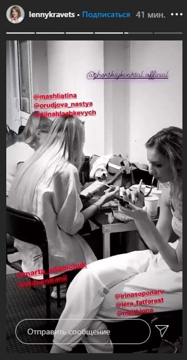 "Вы думаете, почему мы такой профессиональный коллектив? Почему так классно выступаем и хорошо выглядим? Потому что кто не работает - тот ест", - заявила артистка. В ответ девушки возмутились и рассказали, что Кравец поела раньше всех. "Я не ем, росой питаюсь, пищей духовной", - заверила Елена. В черно белом ролике можно заметить, чем коллектив "Женского квартала" занимается во время перерыва. Ирина Сопонару и Екатерина Никитина трапезничают за столом, их коллеги Саша Машлятина, Настя Оруджова и Алина Блажкевич примостились на полу, а вокалистки Элина Мбани и Марта Адамчук присели на стульях у стеночки. Лера Товстолес, видимо, успела перекусить и решила "залипнуть" в смартфон. К сожалению, Елена Кравец опубликовала видео из закулисья не на основном профиле, а в сториз - поэтому поклонники "Квартала 95" не смогли поделиться своими эмоциями от увиденного. Напомним, что юная дочь Елены Кравец из "Квартал 95" показала истинное наслаждение: "Просто бомба" Как сообщала Politeka, Кошевого из «Квартал 95» засняли на свидании со знойной блондинкой, неожиданны кадры: «Жека водил меня…» Также Politeka писала, что звезда "Квартала 95" ошеломила переменами во внешности: "Просто не узнать".