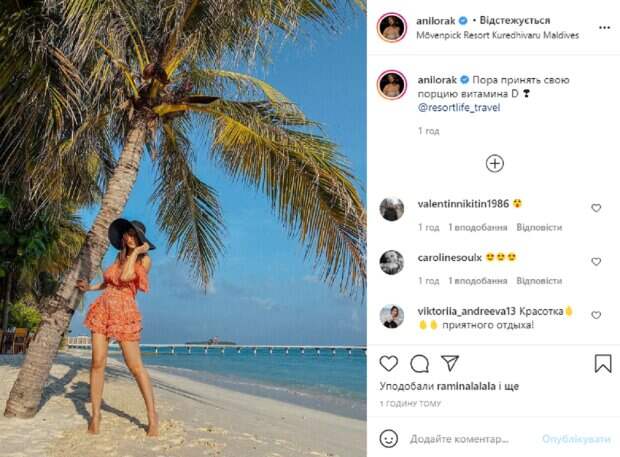На новом фото Ани запечатлена, стоя босыми ногами на белом песке у самой воды, держась за высокую пальму. Перед камерой она появилась в кокетливом наряде – на ней коротенькое оранжевое платье с мелким узором, которое подчеркнуло изящную фигурку и оголило стройные ножки. волосы красотки распущены и покрыты большой темной шляпкой, а на лице нет макияжа, только блаженный вид. В подписи к фотографии счастливая Лорак написала: "Пора принять свою порцию витамина D". Поклонники тут же принялись обсуждать новое фото звезды, восхищаясь ее новым образом и желая хорошего отдыха. "Обалденная", "Наконец-то отдых, хорошо отдохнуть, красотка", "Мальдивы", "Красотка", "Шикарная, как всегда, на все сто просто", "Очень красиво", "Хорошего отдыха", - пишут в комментариях к фото артистки. Напомним, 42-летняя Ани Лорак впечатлила дерзким образом в красном: "Что же мучаете нас?". Как сообщала Politeka, 42-летняя Ани Лорак счастлива и больше не одинока, фото нежностей: "Мой защитник". Также Politeka писала, Любовница экс-мужа Ани Лорак пококетничала перед камерой в костюме зайки: Мурат не смог устоять.