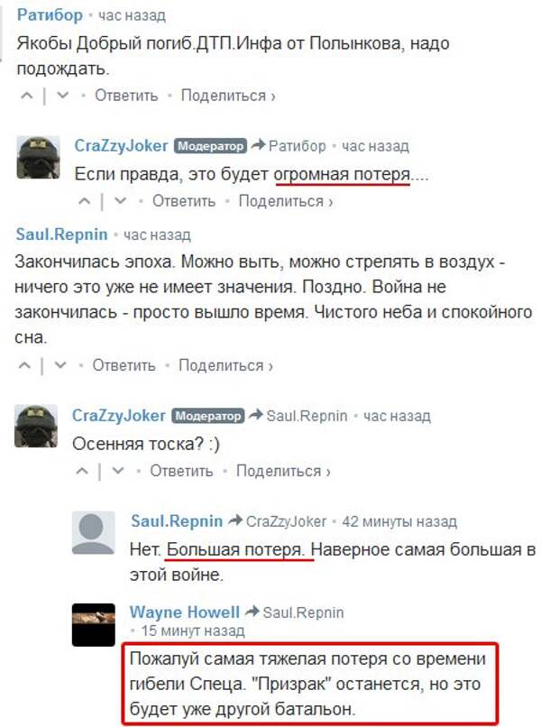 Вроде как видео с места #дтп https://t.co/KVSxoKIbNw #Марков #груз200 #Призрак #4омсбр #2ак #роа pic.twitter.com/qv3YUunfM3 — Necro Mancer (@666_mancer) October 25, 2020 Как пишут в соцсетях боевики, в одном из авто и ехал Марков. По их словам, это «огромная потеря». «Закончилась эпоха. Можно выть, можно стрелять в воздух – ничего это не имеет уже значения. Поздно. Война не закончилась. Просто вышло время», «Пожалуй, самая тяжелая потеря со времени гибели Спеца. «Призрак» останется, но это будет уже другой батальон», – отмечают в комментариях. По словам боевика Александра Жучковского, который воспевает боевика Мозгового в своей новой книге, Марков помогал ему в работе над материалом. «Шесть лет комбат жил и работал на пределе человеческих возможностей, а иногда и за этим пределом, душу вкладывал в дело, в службу. Написать, что с его смертью умер “Призрак”, - это как сказать, что он эти шесть лет ничего не делал, вообще ничего», – философствует в Фейсбуке боевик Михаил Полынков. О Маркове известно, что он приехал на Донбасс еще в 2014 году и воевал на стороне «ЛНР». В августе прошлого года боевик получил звание «подполковника». Напомним, на Донбассе боевик во время пьянки застрелил сослуживца из Ростова. Как сообщала Politeka, в Анголе ликвидирован российский генерал. Также Politeka писала, что Гиркин неожиданно раскрыл, кто "убрал" Моторолу.