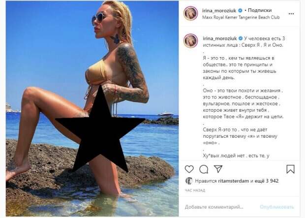 Звезда потянула за веревочки трусиков, делая фото максимально горячим. Об этом пишет Politeka.net со ссылкой на страничку знаменитости. "У человека есть 3 истинных лица : Сверх Я , Я и Оно. Я - это то , кем ты являешься в обществе.. это те принципы и законы по которым ты живешь каждый день. Оно - это твои похоти и желания , это то животное , беспощадное , вульгарное, пошлое и жестокое , которое живет внутри тебя , которое Твое «Я» держит на цепи. Сверх Я-это то , что не даёт поругаться твоему «я» и твоему «оно»", - написала Морозюк. Фанаты поставили почти 4 тысячи лайков и написали комментарии: "Ирина, Вам книгу пора писать про Ваши ценные высказывания! Жгучая красотка", "Собирайте эти мыслив шкатулочку памяти и начинайте работать над книгой. ..", "Ирочка, красоту свою о камни не поцарапай пожалуйста", "Богиня", "Такой красоты не бывает". Сообщалось, что жена украинского футболиста Николая Морозюка показала фигуру без стыда. На фото красотка была в майке белого цвета и все. Трусиков, как и лифчика, на девушке, не оказалось. Звезда сидела на постельном белье, демонстрируя свою фигуру. Напомним, эпатажная жена экс-динамовца Морозюка в мини-бикини показала самые вкусные места А еще Politeka писала, что скандальная жена экс-динамовца Морозюка засветила упругости в гигантском декольте Также Politeka сообщала, что эпатажная жена экс-динамовца Морозюка показала невероятные формы во время тренировки
