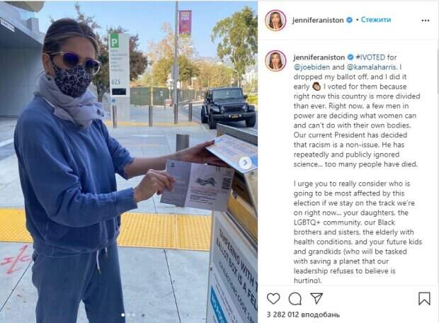 Актриса запечатлена возле урны, куда она опускает свой бюллетень. По словам звезды, она проголосовала за Джо Байдена и Камалу Харрис. Энистон подчеркнула, что сейчас страна разделена более, чем когда либо. «Прямо сейчас несколько мужчин у власти решают, что женщины могут, а что не могут делать со своим телом. Наш нынешний президент решил, что расизм - это не проблема. Он неоднократно публично игнорировал науку ... Слишком много людей погибло», – написала она. Дженнифер призвала сограждан не игнорировать выборы и серьезно подумать, кто больше всего пострадает от этих выборов, если все останется так, как есть сейчас. «Ваши дочери, сообщество ЛГБТ, наши черные братья и сестры, пожилые люди с заболеваниями, и ваши будущие дети и внуки (которым будет поручено спасти планету, которую наше руководство отказывается верить, что это больно). Все дело не в одном кандидате или одном вопросе, а в будущем этой страны и всего мира. Голосуйте за равные права человека, за любовь и за порядочность», – подытожила Энистон. Затем в пост-скриптуме она добавила, что голосовать за репера Канье Уэста – это не смешно, и нужно быть ответственными. Пост Энистон собрал уже свыше 3,2 млн. лайков. Напомним, 51-летняя Энистон скоро станет мамой, родит в ближайшее время: "Расплакалась, когда. ..". Как сообщала Politeka, свадьба Питта и Энистон впечатлила масштабом, денег не пожалели: новые фото и подробности торжества. Также Politeka писала, что Энистон раскрыла правду о браке с Брэдом Питтом, у Джоли не было шансов: «Мы занимались…».