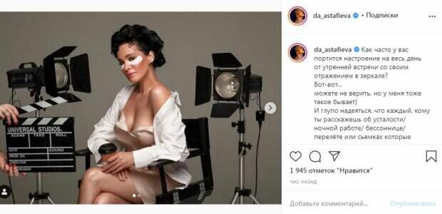 При этом тонкие бретельки она приспустила, чтобы сделать кадры погорячее. Сверху платья артистка надела белую рубашку, которую скинула с плечей. Даша сидела на высоком стуле, закинув ножку на ножку. Нежный макияж и патчи под глазами завершили интересный образ знаменитости. Также внимание привлекали крупные локоны на голове. В посте Астафьева рассказала, что у нее, как и у всех остальных людей, портится настроение на весь день, после увиденного отражения в зеркале. "В моем случае скажут , «уже не та» а еще напишут гадости под постом, где хочется с вменяемыми фолловерами поделиться воспоминаниями или мыслями....", - написала Даша. За час пост собрал почти 2000 лайков и много комментариев. "Ох, богиня", "Невероятная !!!