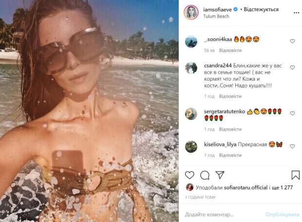 Но этого ракурса хватило, чтобы увидеть худобу 19-летней девушки. «Небо вверху, внизу песок», - подписала фото Евдокименко. За короткое время ее пост собрал более тысячи лайков. В комментариях ей оставили массу приятных слов. Не обошлось и без критики. Поклонники обратили внимание, что Соня слишком худая. Складывается впечатление, что ее худоба нездоровая. «О Господи ты просто бесподобная», «Слишком худая», «Красавица София», «Супер Фото», «Идеально», «Блин, какие же у вас все в семье тощие! Вас не кормят что ли? Кожа и кости..Соня! Надо кушать!», «Прекрасная», «Худая такая», - пишут пользователи сети. Ранее мы писали, что Соня Евдокименко эффектно приспустила пиджак ради пикантного кадра. Девушка дополнила образ едва заметным макияжем и элегантной укладкой. Как известно, красотка учится за границей, где пытается развивать свой блог в Инстаграм. Напомним, что новая беда подкосила рекордно обедневшую Софию Ротару: появились подробности и фото с места ЧП. А еще Politeka писала, что София Ротару оказалась в эпицентре скандала в России, досталось Пугачевой: "В отличие от той же Алки...". Также Politeka сообщала, что София Ротару оказалась не нужна в России, директор певицы сообщил детали: "У Софии Михайловны. ..".