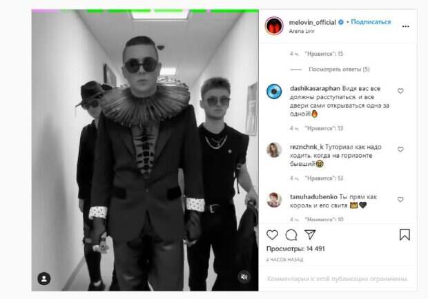 Не забывает певец и об Инстаграм, где делится с фанатами самым интересным. На новых кадрах MELOVIN показал закулисье, как он вместе со своей командой шел по коридорам Львов-Арены. Молодой человек был в эффектном винтажном костюме, а за ним шла его команда. В какой-то момент гитарист показал жест, проведя пальцем по горлу. "Доброе утро дамы и господа", - написано было под видео. Фанаты посмотрели ролик тысячи раз и написали комментарии: "Один из самых потрясающих луков", "А где-же эффект слоу-мо", "Напоминает момент какого-то голливудского фильма", "По тебе сразу видно, куда ты идёшь - завоевывать мир!", "Как ни крути для меня ты в этом образе - Пьеро", "Видя вас все должны расступаться, и все двери сами открываться одна за одной!". Напомним, фаворит Данилко MELOVIN удивил новой выходкой на сцене, бросив стойку микрофона А еще Politeka писала, что фаворит Данилко MELOVIN после скандала показал, как готовится к новому выступлению Также Politeka сообщала, что фаворит Данилко MELOVIN признался, как родители отнеслись к его громкому каминг-ауту