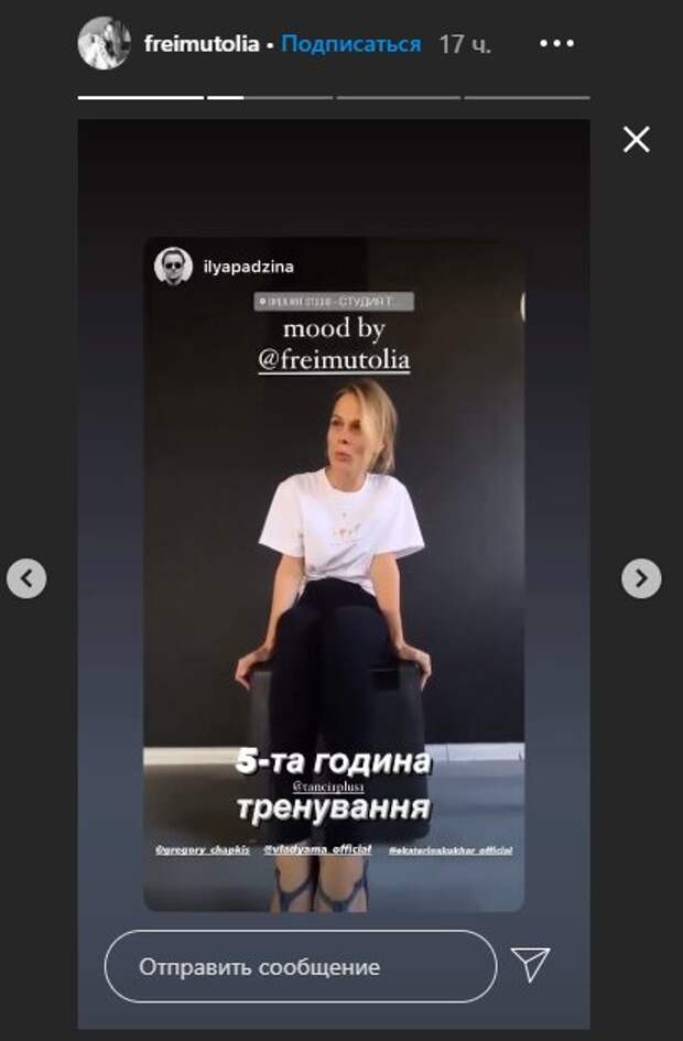 На пятом часу напряженной тренировки накануне очередного эфира "Танців з зірками" телеведущая Ольга Фреймут не выдержала Как передает Politeka.net, звезда "Ревизора" поделилась свежими кадрами в своих "сториз" в Инстаграм, на которых пожаловалась партнеру по танцам Илье Падзине. Так, Ольга обсудила всю "тяжесть", с которой ей приходится сталкиваться, и которую по достоинству оценить может только Григорий Чапкис (народный артист Украины, один из судей проекта).