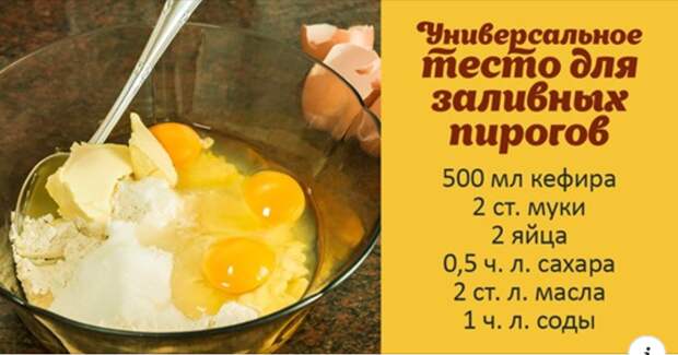 Долгое время я находилась в поисках универсального рецепта теста для выпечки. Как-то на выходные, в гости зашла свекровь и рассказала об очень хорошем рецепте приготовления наливного теста. Главная фишка в том, что используется кефир, а сам процесс приготовления очень легкий и занимает всего несколько минут.