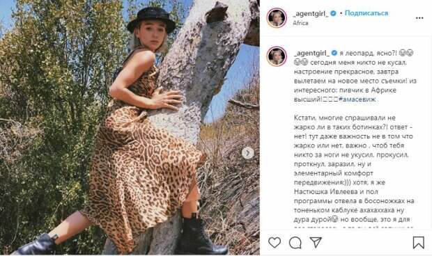 Для эффектной фотосессии звезда подобрала высокие кожаные ботинки и "леопардовое" платье. "Я леопард, ясно? Сегодня меня никто не кусал, настроение прекрасное, завтра вылетаем на новое место съемки! из интересного: пивчик в Африке высший!", - рассказала она в Instagram. Жена популярного рэпера Элджея также добавила, что из-за внешнего вида ее часто называют "гопником", поэтому во время съемок она также использовала босоножки на тоненьком каблуке. "Я же Настюшка Ивлеева и пол программы отвела в босоножках на тоненьком каблуке, ахахаххаха ну дура дурой. Но вообще, это я для вас старалась, а то вы всё гопник да гопник. Короче, в программе все увидите", - говорится в подписи к новым снимкам. Фотосессия пришлась по душе фанатам, которые засыпали Настю Ивлееву восторженными комментариями. "Придётся ехать в Африку за пивчанским", "Клеопатра", "Огонь девица", "Какая красивая", "Дикая кошечка", "Шальная императрица", "Красотка наша! Настя ты самая лучшая! Ответь пожалуйста!", "Грация кошки -ловкость картошки, обожаю тебя", - написали они под подборкой фото. Напомним, что Настя Ивлеева в полупрозрачной блузе засветила лишнюю часть тела Как сообщала Politeka, дерзкая Ивлеева поиграла язычком, взбудоражив горячим образом Также Politeka писала, что Ивлеева застыла в пикантной позе, показав себя без прикрас