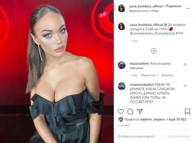И вот недавно Яна показала на своей странице в Инстаграм новое фото. Красотка похвалилась шикарной грудью. На Кошкиной было надето черное платье почти полностью открывающее бюст модели. Также открыты плечи и шея знаменитости. Фанаты искупали Кошкину в заслуженных комплиментах. "Красотка