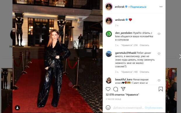 Для выхода в свет певица выбрала весьма эффектный образ. Она надела черный костюм из материала, напоминающего помятый целофан. При этом, мешковатые брюки костюма оказались настолько длинными, что полностью закрывают ноги певицы вместе с обувью. Несмотря на такой странный наряд, выглядит Лорак очень уверенно. Она смотрит прямо в камеру, положив руку на талию. Поклонники исполнительницы тут же принялись комментировать ее фото. «Дива Ани Лорак пришла за заслуженной наградой «Grammy» – по-другому это фото не прокомментируешь», «Бог ты мой, ну что за красотка», «Образ огонь», «Необыкновенно красивая», «Огонь фото, фигура, и Сама Каролина», «за день до премии: популярная певица Ани Лорак скупила все мусорные пакеты», «Даже в целофане такая красивая», «Каролина, много черного», «Ох, ну и комбинизо, как будто работает на стройке», - пишут люди в комментариях. Напомним, Ани Лорак выставила напоказ опухшие губы-вареники после филлеров: "Куда-то занесло". Как сообщала Politeka, Ани Лорак похвасталась кадрами с повзрослевшей дочерью, Соня пошла по стопам матери: "Как она запела...". Также Politeka писала, что Ани Лорак после скандального развода и примирения с бывшим мужем заговорила о любви: "Жалко…".