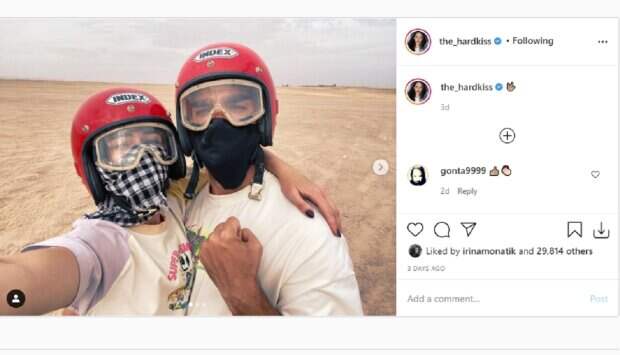 Юлия и Валерий отправились в путешествие на багги по бескрайним просторам. Чтобы защититься от ветра, супруги надели красные шлемы с очками и закрыли лица масками, а кроме того нарядились в похожие белые футболки с принтами. Несмотря на пустынное обмундирование, музыканты не сдержали своей любовной страсти и поцеловались прямо сквозь ткань. В этот момент Юлия нежно обняла своего мужа и сделала селфи на фоне пустыни. Пользователи соцсети восхитились неугасаемыми чувствами звездной пары в комментариях: "Поцелуй по всем правилами карантина