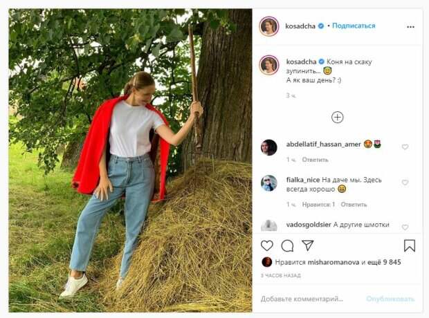 Об этом пишет Politeka.net со ссылкой на страничку знаменитости. "Коня на скаку остановит... А как ваш день?", - написала Осадчая. Фанаты поставили почти 10 тысяч лайков и написали комментарии: "На даче мы. Тут всегда хорошо", "А другие шмотки есть, то как извините, подстреленный вид такой", "А вдруг там кто то уснул", "Нормальные ведьмы на метле летают, а ты сразу на вилах) практично, что",, Какая ты заводная. День начался хорошо", "Ляшко отдыхает". Ранее мы сообщали, что телеведущая Катя Осадчая нашла альтернативу дорогому заграничному отдыху в родной Украине. Звезда экрана опубликовала на своей странице в социальной сети Инстаграм несколько снимков, на которых запечатлен ее отдых в загородном спа-комплексе во Львовской области. Сообщалось, что известная украинская телеведущая Катя Осадчая показала летний образ и поздравила всех украинцев. На фото Осадчая показывает себя в бело-голубом платье с приличным декольте и без белья. Красотка решила оставить волосы распущенными и смотрела на камеру, демонстрируя легкий макияж и венок, который был на голове. Напомним, Горбунов на людях показал, как любит Осадчую, пикантное фото А еще Politeka писала, что Осадчая, Огневич, Tayanna и другие звезды поразили новыми образами, фоторепортаж Также Politeka сообщала, что Осадчая заставила Злату Огневич рассказать о романе с топ-политиком