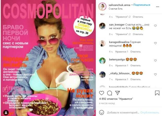 Анна Саливанчук, актриса и жена продюсера "Квартал 95" Александра Божкова, снялась для обложки глянцевого журнала Артистка показывает много кадров из своих будней, любит рассказывать о том, какие выводы из жизненных уроков делает и постоянно поучает поклонников о том, как надо жить всегда на позитиве.