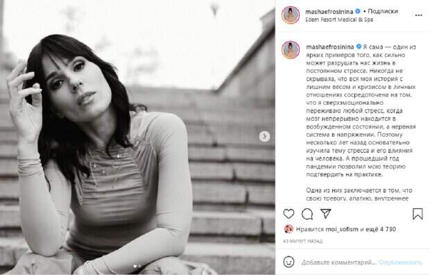 Ведущая Маша Ефрсинина решила откровенно поговорить на тему стресса, не забыв запостить атмосферные снимки Как известно, Маша Ефросинина регулярно общается с поклонниками посредством соцсетей. Ведущая делится с ними не только зарисовками из своей жизни, но и дарит мотивацию и вдохновение, а также ведет разговоры на щекотливые темы.
