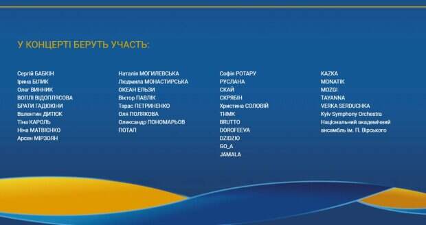 В частности, стало известно, что в концерте примут участие Тина Кароль, Олег Винник, Оля Полякова, Монатик, Верка Сердючка, "Океан Эльзы", София Ротару, Виктор Павлик, Надя Дорофеева, Наталья Могилевская и другие звезды. Также на сцене выступят танцоры, украинцев ждет и масштабное световое и дрон-шоу. Все будет транслироваться на огромных экранах. А завершится действие яркими фейерверками. Стоимость билетов - от 200 до 2500 гривен. Отметим, что ранее из концертной программы исключили группа Green Grey. В Офисе президента объяснили причину этого - солист некорректно высказался о языковом законе, а также выразил свое неуважение к украинскому народу. В свою очередь солист Green Grey Дмитрий Муравицкий ответил, что выразил свое неуважение к закону о языке, а не к самому украинскому языку. По его словам, он чтит Конституцию страны, но не обязан хвалить действия депутатов. Напомним, Тина Кароль удивила признанием после совместного выхода с Зарицкой из KAZKA Как сообщала Politeka, Тина Кароль ошеломила радикальными переменами во внешности Также Politeka писала, что Кароль во время концерта отобрала телефон у поклонника