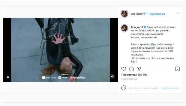 Тина Кароль в кожаном костюме впечатлила дерзкими движениями и рассказала о том, рядом с кем могла бы почувствовать себя слабой Популярная украинская певица после выхода своего клипа на песню «Скандал» поделилась его отрывком в Инстаграм и рассказала о своем успехе. Об этом пишет Politeka.net. Так, Кароль похвасталась тем, что ее клип уже четвертый день подряд держится в трендах Youtube на первом месте, а сам сингл занимает верхние позиции на всех стриминговых площадках.