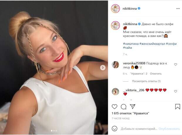 Екатерина активно ведет социальные сети и делится там моментами из своей жизни. Так, на этот раз девушка поделилась новой серией фотографий. На сэлфи Екатерина с непривычным для себя макияжем, а именно с красной помадой. "Давно не было селфи. Мне сказали, что мне очень идёт красная помада, а вам как?) ", спрашивает у поклонников артистка. Фанаты завалили актрису положительными словами в комментариях: "Красивая помада, тебе идет", "Подлецу всё к лицу", "Помада огонь! Тебе очень идëт!", "Все фото класс...последняя вообще супер, Никитина, так держать", "Очень-очень". Ранее сообщали, блондинка из «Женского квартала» высоко задрала ногу в коротком платье, удивив позой: «Жизнь на чемоданах» Также, блондинка из "Женского квартала" в мини-бикини выставила напоказ упругие формы: "Хороший орешек" Politeka рассказывала, блондинка из "Женского квартала" Никитина в коротком топе показала гибкость на яхте: "Идеальная"
