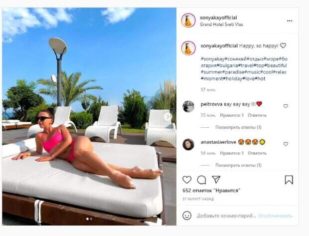 Сейчас красотка отдыхает в Болгарии, куда отправилась практически сразу после сказочных Мальдив. Не забывает девушка и о социальных сетях, где публикует самое интересное. На новых фото, которые Соня опубликовала в Инстаграм, красотка лежала на кровати. Красотка была в розовом мини-бикини и стильных очках. Девушка вытянула ножки, впечатляя стройностью. "Счастье. Так счастливы", - написала под фото Соня. Фанаты поставили более 600 лайков и написали комментарии: "Вау, вау, вау", "Красивая", "Очень красиво", "Соня, какая ты красотка! Привет маме! Хорошего вам отдыха и отличного настроения!", "Вай какая красотка. Сонечка ты очень красивая". Напомним, племянница Софии Ротару в мини-шортиках растаяла в объятиях любимого Также Politeka сообщала, что племянница Ротару устроила релакс, наслаждаясь последними лучами солнца А еще Politeka писала, что племянница Софии Ротару в красном купальнике похвасталась отдыхом на курорте