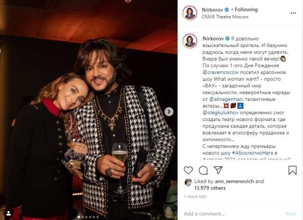 На одном из фото довольный Филипп Киркоров позирует рядом с Екатериной Варнавой, которая взяла его под руку и нежно прижалась к плечу высокого исполнителя. На актрисе можно заметить черный пиджак с красным воротником и манжетами, вероятно, в таком наряде красотка играла на сцене. Стоит отметить, что в руках Филипп держит бокал с шампанским или похожим напитком. На другом снимке певец покрасовался рядом с модельером Алиной Герман. "Я довольно взыскательный зритель. И безумно радуюсь, когда меня могут удивить. Вчера был именно такой вечер!