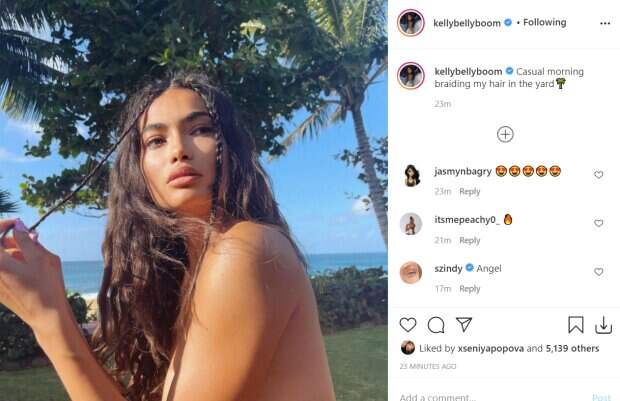 Загорелая кожа модели прекрасно гармонирует с таким диким образом и придает кадру первобытной пикантности. Келли Гейл вышла на лужайку и принялась делать себе прическу в лучах восходящего солнца. В какой-то момент она отвлеклась от занятия и завороженно засмотрелась на что-то за кадром. На заднем плане видны пальмы, низенькая живая изгородь и песчаный пляж, судя по всему, домик модели находится в шаговой доступности от воды. "Обычное утро. Заплетаю свои волосы во дворе", - подписала снимок звезда Victoria’s Secret. Пользователи сети в комментариях засыпали Келли Гейл приятными комплиментами о ее внешности и раскрепощенности: "Горячая"; "Удивительно сексуальная"; "Просто великолепная"; "Такая прекрасная"; "Такая причудливая красота ❤️