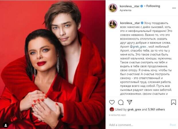 Уже взрослый ребенок от Тарзана обнял звездную маму сзади в такой же красной шубе. "Хочу поздравить всех мамочек с днём сыновей, хоть это и неофициальный праздник! Это совсем неважно. Важно то, что это возможность сплотиться, сказать друг другу добрые и важные слова. Архип, мой любимый Архип, спасибо тебе, за то что ты у меня есть. Это такое счастье быть мамой мальчика, юношы, мужчины. Такое счастье смотреть на тебя и видеть в тебе своё продолжение, свою опору", - подчеркнула Наташа Королева в описании к фото. - "Я очень хочу, чтобы ты был счастлив! А счастье построить самому - это ответственный и кропотливый труд, сложная работа, прежде всего над собой. Пусть все сыновья радуют своих мам заботой, достижениями, своим счастьем и своей любовью!". В комментариях Архип тоже высказался о любви к маме, а пользователи присоединились к поздравлениям: "Красивые