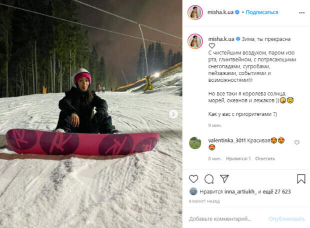 Так, Ксения поделилась кадрами на снежном склоне горы. Девушка пыталась освоить сноуборд, побаловавшись перед камерой. На одном из фото Мишина уселась на снег и показала язык Эллерту, который ее в этот момент снимал. Некоторые из пользователей по необъяснимой причине взъелись на актрису, посчитав ее поведение слишком неинтеллигентным. "А я не люблю высунутый язык на фото взрослых людей, мой приоритет. Отписываюсь"; "И я. Язык на фото - это показатель низкого интеллекта", - прокромментировали возмущенные украинки. Мишина не смогла пройти мимо и написала в ответ: "Вам бы в приоритет проще смотреть на мир )". Не смолчал и ее возлюбленный, кинувшийся на защиту. "О, псина опять отвязалась