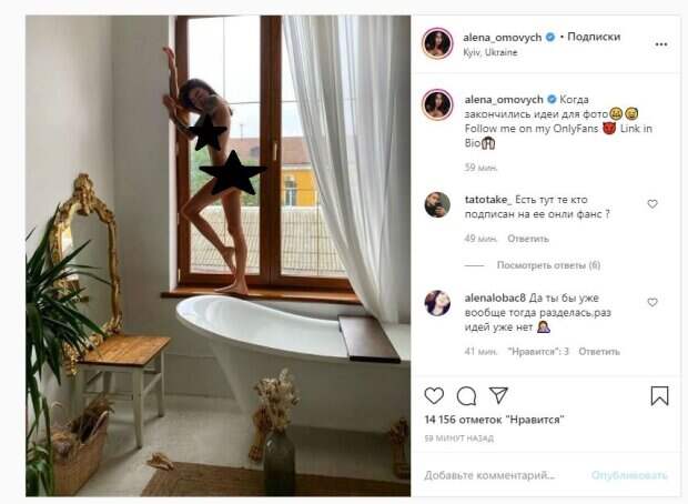 Волосы у Алены были распущенными, а показалась модель в ванной комнате. Можно на кадре заметить не только пышный бюст звезды, но и точеную фигуру. Об этом пишет Politeka.net со ссылкой на страничку знаменитости. "Когда закончились идеи для фото", - подписала красавица. Фанаты поставили более 14 тысяч лайков и написали комментарии: "Да ты бы уже вообще тогда разделась,раз идей уже нет", "У тебя 42-ой размер ноги?", "Соседи в восторге", "они с другой планеты походу", "Твои соседи кайфуют", "Прекрасная, как обычно", "Красота тела и не важно сделано это или нет, прелесть в стремлении к идеалу своему собственному". Ранее мы сообщали, что известная модель Алена Омович покорила видами в белье. Знаменитость сверкнула бюстом, который едва ли не выпрыгивал из белья, а тонкие бретельки впивались в плечи. Сквозь тонкое кружево проглядывалось идеальное тело модели, а большие вырезы по бокам оголили бедра. Напомним, украинская Кардашьян похвасталась непривычными образами Также Politeka писала, что украинская Кардашьян без белья распахнула кожаный пиджак и кокетливо посветила бюстом А еще Politeka сообщала, что украинская Кардашьян обтянула бюст шестого размера полупрозрачным топиком
