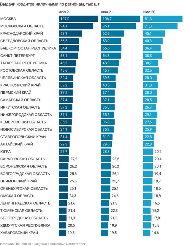 В Татарстане в июле 2021 года выдача кредитов наличными упала на 6% — это наибольшее сокращение среди среди 30 российских регионов, в которых граждане в прошлом месяце оформили наибольшее количество кредитов. Такие данные приводит Объединенное кредитное бюро. Всего в июле 2021 года татарстанцы взяли 46,2 тыс.