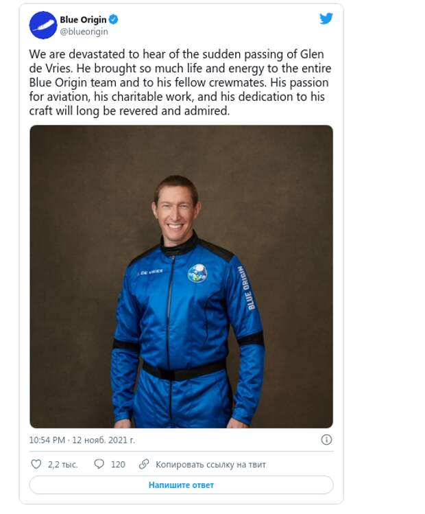 Он привнес так много жизненной энергии в работу компании и для своих товарищей по полету. Его страстью к полетам, благотворительной деятельностью и увлеченностью делом будут восхищаться», — пишет пресс-служба. 12 ноября телекомпания CBS сообщила, что в результате авиакатастрофы погибли два человека де Ври и бизнесмен пилот-любитель 54-летний Томас Фишер. Телеканал также сообщил, что самолетом управлял де Ври. Самолет летел из аэропорта округа Эссекс в аэропорт округа Сассекс. В 15:00 по местному времени (23:00 мск) самолет с двумя пассажирами был объявлен без вести пропавшим. Позже выяснилось, что самолет потерпел крушение в лесистой местности рядом с озером Кема в штате Нью Джерси. Напомним, 13 октября 2021 года корабль New Shepard компании Blue Origin Джеффа Безоса совершил второй пилотируемый полет, на борту которого находились четыре туриста. Туристами были вице-президент французской компании Dassault Systemes Глен де Ври, 90-летний канадский актер Уильям Шетнер, известный благодаря своей роли в качестве капитана звездолета Enterprise Джеймса Кирка в сериале и фильмах Star Trek, вице-президент Blue Origin по полетам Одри Пауэрс, бывший инженер НАСА и сооснователь компании Planet Labs Крис Бошуайзен. 20 июля сообщалось, что Blue Origin до конца 2021 года запустит два корабля с пассажирами. Безос тогда заявил, что не уверен в том, будет ли компания осуществлять пилотируемые запуски в 2022 году.