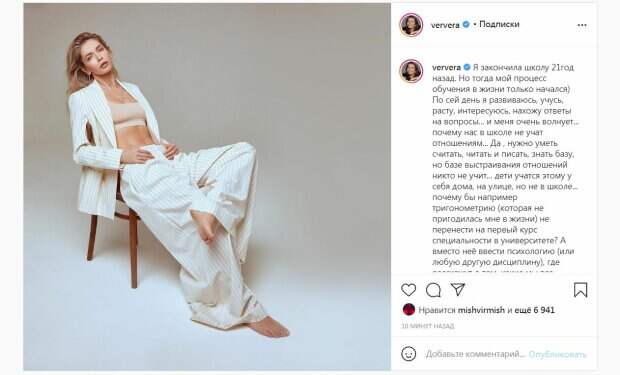 Короткий наряд, оголял виды на упругий живот красотки, а также обтянул ее грудь. Брежнева сверху надела полосатый жакет, который распахнула ради эффектного кадра. Также звезда была в брючках, подчеркнувших ее тонкую талию. Певица распустила длинные волосы и смотрела в камеру, приоткрыв губы. В посте артистка рассказала, что окончила школу 21 год назад, но при этом продолжает учиться и развиваться. Далее певица задалась вопросам, почему в школе не учат отношениям. "Базе выстраивания отношений никто не учит... дети учатся этому у себя дома, на улице, но не в школе... почему бы например тригонометрию (которая не пригодилась мне в жизни) не перенести на первый курс специальности в университете? А вместо нее ввести психологию (или любую другую дисциплину)...", - рассуждала звезда. По словам Веры, такие навыки пригодятся человеку даже с самого юного возраста, ведь таким образом, можно правильно выстраивать отношения с родителями, друзьями, любимыми. "Почему мы учимся самому главному - уметь жить, только когда проживаем полжизни... и вообще, а можно ли иначе?", - написала Вера в конце. Напомним, что Брежнева похвасталась любимым развлечением с Меладзе, удивив внешностью: "Разницы в возрасте не заметно". Как сообщала Politeka, Брежнева откровенно рассказала о том, как ей приходится "трудиться" над отношениями: "Игра в одни ворота...". Также Politeka писала, что младшая дочь Брежневой затмила красотку-маму безбашенным танцем, певица не сдержалась: "Я тебя...".