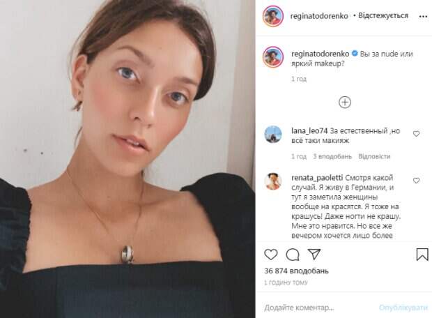 Большие глаза ведущей, которые всегда были ее фишкой, теперь выглядят еще более выразительными. «Вы за nude или яркий makeup?», - спросила звезда у своих поклонников. За час ее фото собрало более 35 тысяч лайков. В комментариях поклонники стали обсуждать, какому макияжу они отдают предпочтение. «Чем старше, тем «нюдовее и нюдовее», если можно так сказать», «Я за естественность», «Регина, ты красотка», «Для меня все должно быть в меру», «Мне кажется, что вам всякий makeup подойдёт. Но все таки я за яркий», «Регина, ты без макияжа красавица!», «Я за внутренний комфорт. Если комфортнее с Мейком - ок. Если Мейк доставляет дискомфорт – нафиг», - пишут пользователи сети. Ранее мы писали, что Регина Тодоренко сверкнула фигуркой в купальнике. Артистка позировала возле моря в желтом купальнике без принтов. Видно, что после родов звезда успела привести себя в форму, похудев на 18 килограмм. Напомним, что Тодоренко впервые за долгое время показалась в купальнике, поразив видом: «Регина, оденьтесь». А еще Politeka сообщала, что Тодоренко без капли смущения задрала юбку и выставила напоказ свои достоинства: "Регина умеет...". Также Politeka писала, что Тодоренко в разных позах засняли с известным красавцем, Топалов будет рвать и метать: "Вот это уже. ..".