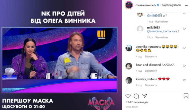 После выступления Розы, которой оказалась украинская певица Алина Гросу, Олег Винник начал рассказ о легендах, которые ходят вокруг него. «Я помню, кто-то когда-то мне говорил, что от моего поцелуя в живот девушки беременеют. Я думал, что шутят. Поэтому друзья мои, это не непорочное зачатие, это поцелуй мой. Пойду я отсюда», – заявил Винник. Коллеги Винника стали смеяться, а Настя не сдержалась и вывалила всю правду о работе с артистом. «А вы думаете, почему мне всегда говорят, что я беременна? Я уже родила 45 детей. Потому что я сижу во всяких разных шоу с Олежкой и прячу тех детей», – заявила артистка. В комментариях стали обсуждать шоу и поведение детективов. «Какие смешные», «В Украине намного лучше шоу Маска! Костюмы красивее намного! Шикарные костюмы!», «Вот это новости», - пишут пользователи сети. Напомним, что Олег Винник огорошил признанием о беременных от него девушках: "Друзья мои, это...". Как сообщала Politeka, Каменских похвасталась огромной гардеробной, одежды и обуви больше, чем в магазине: "Потапу каждое утро...". Также Politeka писала, что кокетливая Каменских в расстегнутой кофте устроила идеальный соблазн: "А круто получилось!".