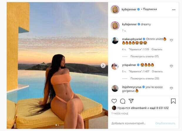 Известная модель Кайли Дженнер показала себя в мечтательном образе На фото Кайли показалась в оранжевом купальнике. Звезда сидела на матрасе, хвастаясь шикарным видом неба. Волосы у Дженнер остались распущенными, а сама красотка соблазнительно выгнулась и закинула ножку за ножку, делая кадр еще более сочным.