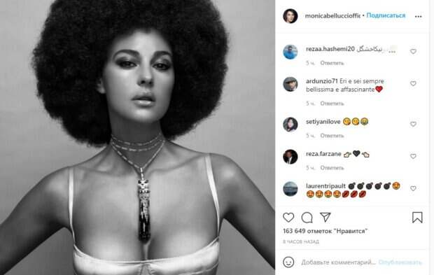 Этот раз не был исключением. На своей странице в социальной сети Инстаграм Моника поделилась фото с новым образом, на котором позировала в атласном наряде с глубоким декольте и смогла покорить даже необычной прической. Она примерила несвойственный ей дерзкий образ: надела шелковый наряд с глубоким декольте, подчеркнула формы и надела довольно крупный аксессуар от Cartier. Также Моника выделила глаза темными тенями, а в качестве прически были выбраны пышные афрокудри. «Невероятная моделька, просто потрясающая