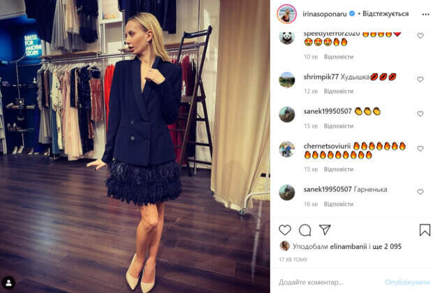 Что было под пиджаком трудно рассмотреть, но снизу торчала эффектная юбка. Образ дополняли бежевые классические туфли-лодочки. Сама Ирина стояла в каком-то шоуруме и смотрела в сторону. «Девочки, кто в чем встречает Новый Год?», - поинтересовалась у поклонников Ирина. В комментариях стали делать комплименты звезде «Женского квартала». «Ириш, отличный вариант», «Хорошенькая», «Худышка», «Супер», «Красота», «Огонь», «Красотка», - пишут пользователи сети. Как известно, Ирина Сопонару является одной из ведущих актрис в «Женском квартале». Кроме этого, она снимается в скетч-комедии «Страна У». Не так давно Ирина заменила Елену Кравец в «Чисто News», которые выходят в эфир сразу после серьезных новостей. Ранее мы писали, что Ирина Сопонару в расклешенных штанах соблазнительно изогнулась возле красного холодильника. Девушка во всей красе продемонстрировала свою замечательную фигурку. Напомним, что Ирина Сопонару заставила глотать слюнки, показав свое "коронное блюдо" в узких джинсах: "Огонь!. Как сообщала Politeka, Ирина Сопонару влюбила в себя видом в белом кружеве: «Сумасшедший бриллиант». Также Politeka писала, что Ирина Сопонару свела с ума роковым образом: «Как здесь не влюбиться».