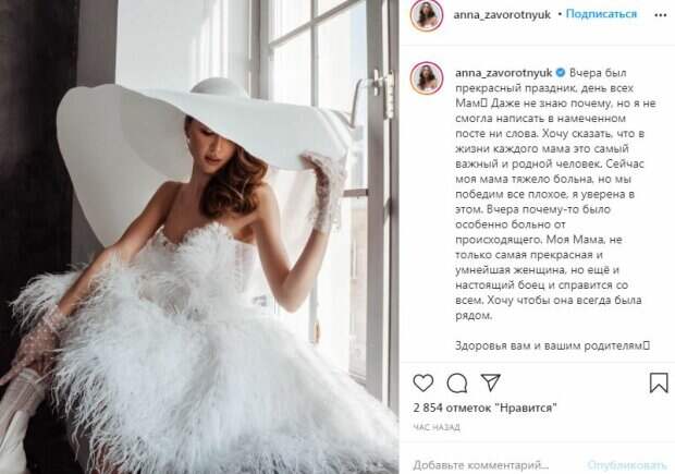"...Хочу сказать, что в жизни каждого мама это самый важный и родной человек. Сейчас моя мама тяжело больна, но мы победим все плохое, я уверена в этом. Вчера почему-то было особенно больно от происходящего. Моя Мама, не только самая прекрасная и умнейшая женщина, но ещё и настоящий боец и справится со всем. Хочу чтобы она всегда была рядом. Здоровья вам и вашим родителям", - написала она в своем Instagram. Откровенную публикацию Анна Заворотнюк сопроводила снимком, на котором она блистает в эффектном белом платье, соблазнительных чулках и шляпке. Поклонники в комментариях поблагодарили Анну за откровенность и поддержали онкобольную Анастасию Заворотнюк. "Дай Бог Настеньке здоровья", "Анечка, все обязательно наладится", "Скорейшего выздоровления, мы очень любим и ждём Анастасию, это всего лишь испытания, всё пройдёт", "Анют, всё будет хорошо, вот увидишь. Мы все с вами", "Анечка у тебя замечательная мама, она обязательно поправиться, всё будет хорошо", "Анечка, вы обязательно справитесь. Только верьте, ваша мама очень добрая, умная, красивая женщина, она победит все невзгоды, а когда рядом такие замечательные люди как вы, просто нельзя не победить. Мы с вами, мы за вас, не теряйте надежды", "Дай боже, всё будет хорошо, мы все ждём и верим", "Шикарнная какая", "Анастасия -красавица и умница, жду ее выздоровления очень", - написали они в Instagram. Ранее мы рассказывали, что Анна Заворотнюк сбежала из загородного особняка и похвасталась своей квартирой в Москве. Дочь онкобольной "Моей прекрасной няни" самостоятельно выбирала дизайн интерьера и отдала предпочтение светлым оттенкам, чтобы в доме было больше визуального пространства. Анна Заворотнюк успела купить телевизор, стиральные машины, но большую мебель пока придется подождать, поэтому она не может еще отметить новоселье в квартире. Напомним, дочь больной раком Заворотнюк поразила беззаботным видом на прогулке. Как сообщала Politeka, дочь больной раком Заворотнюк поласкала свое нежное лицо на камеру. Также Politeka писала, что дочь больной раком Заворотнюк завернулась в кожу и сверкнула голыми ногами.