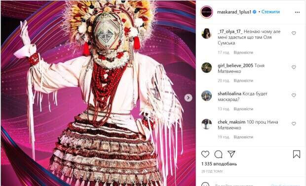 В комментариях к постам украинцы каждый раз пытаются догадаться, какую звезду скрыли в том или ином образе, ведь организаторы каждый раз дают поклонникам подсказки. На этот раз стало известно, что новой героиней шоу стала аутентичная Мотанка. "По легенде шоу, Мотанка - это берегиня украинской культуры и стильный, фольклорный персонаж. Ее история связана с обрядами плодовитости и продолжения рода. В древности люди верили, что в Мотанке живет дух предка. Этот персонаж олицетворяет в себе вечные ценности, семейный уют, традиции и родную землю", - пишут на странице шоу. Поклонники "Маскарада" сразу начали писать о своих догадках, большенство думает, что это певица Нина Матвиенко. "Я думаю, что это Джамала или Tayanna"," Тоня Матвиенко
